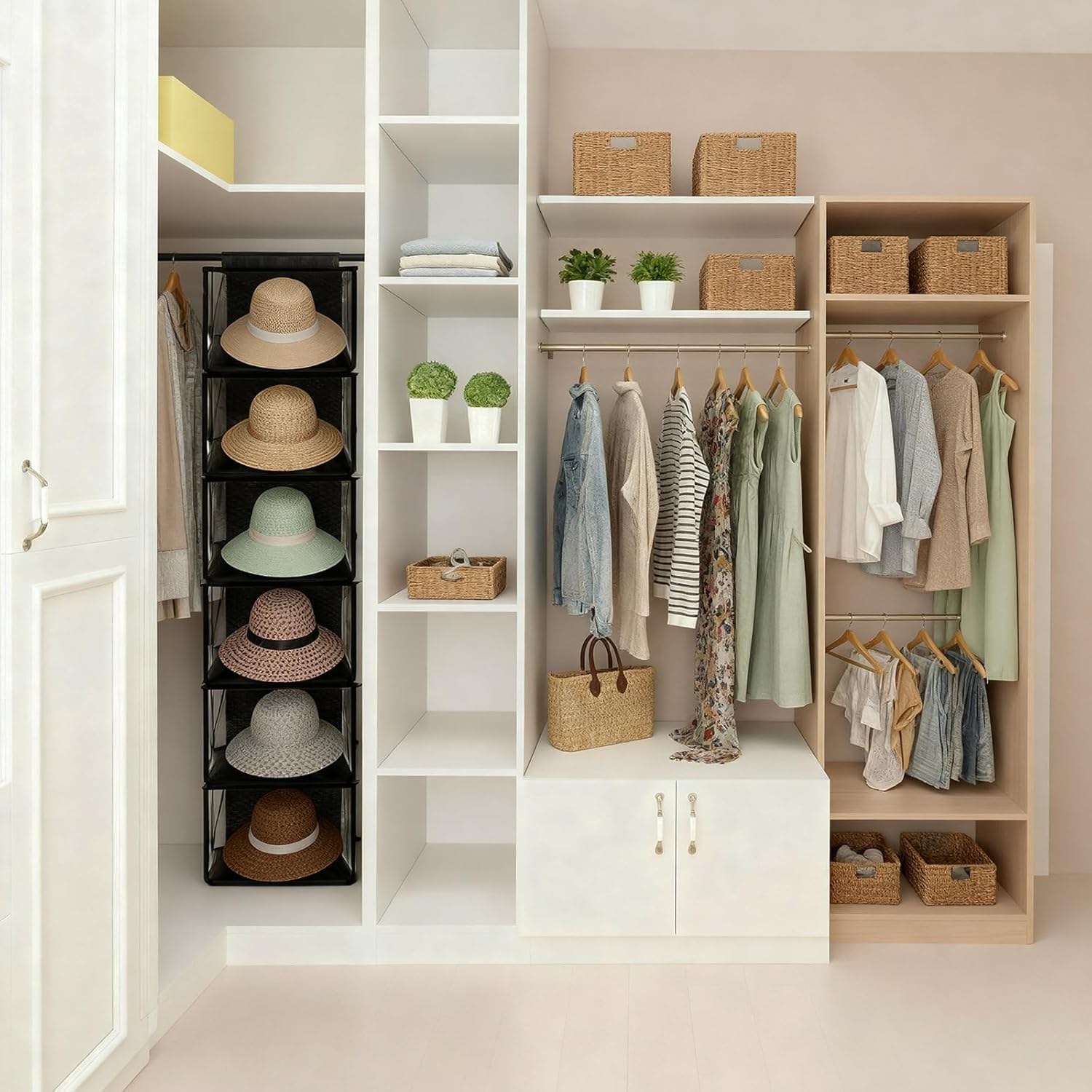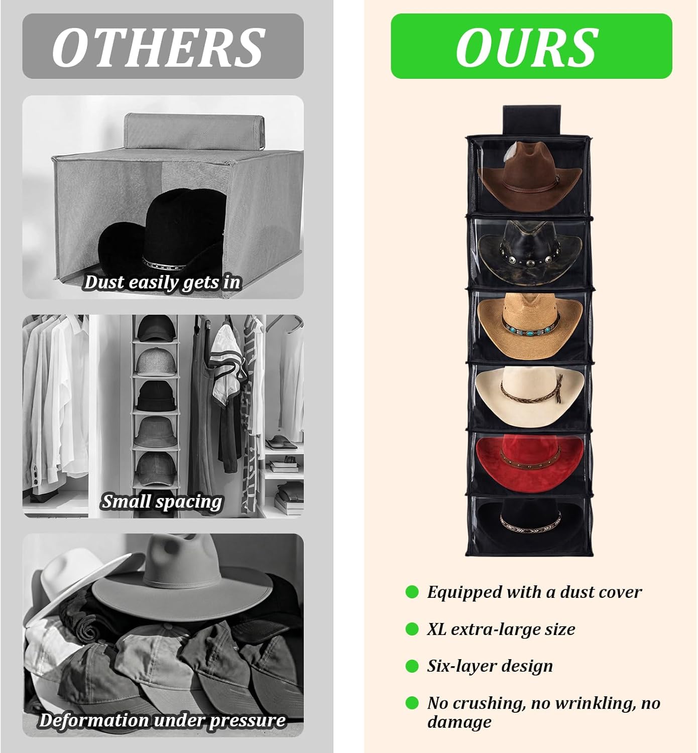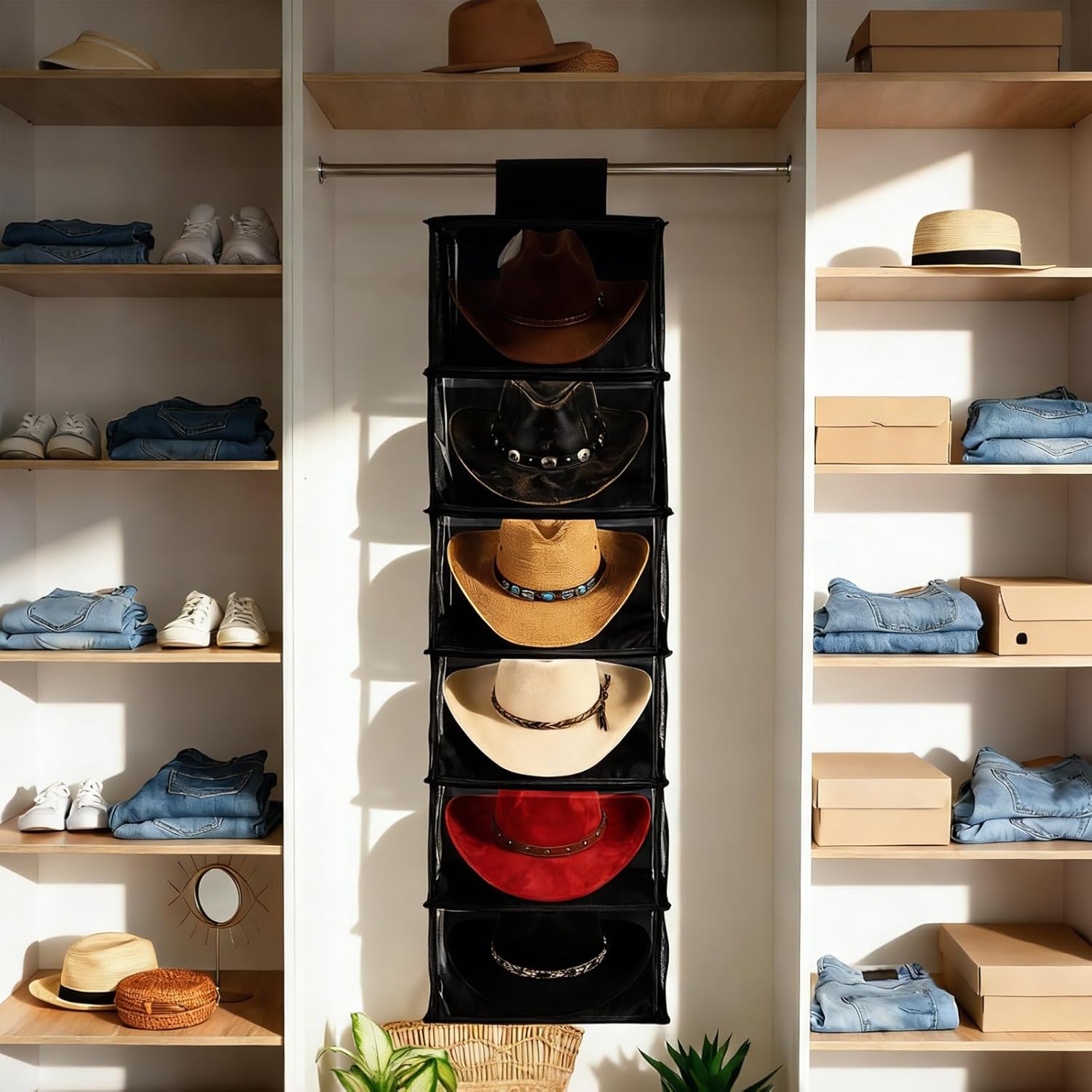 Features: A considerate gift choice Combining practical utility with a sleek appearance, this hat rack makes a thoughtful gift for hat enthusiasts, organized individuals, or friends and family who value their fashion accessories. It shows appreciation for their style and need for order, offering a present that is both tasteful and highly functional. Secure hanging and closure system Designed for stability this hanging closet hat holder uses a secure hanging structure combined with hook and loop closures to help keep hats in place Black hanging cowboy hat covers offer a clean look that blends easily with most closets while supporting organized and reliable hat storage Specifications: Material: 420D high density Oxford fabric Color: black Size: 8"H x 17"D x 13"W Total height: 48" Package includes: 2 x Cowboy Hat Rack Storage Notes: Manual measurement, please allow slight errors on size. The color may exist a slight difference due to different screen displays
