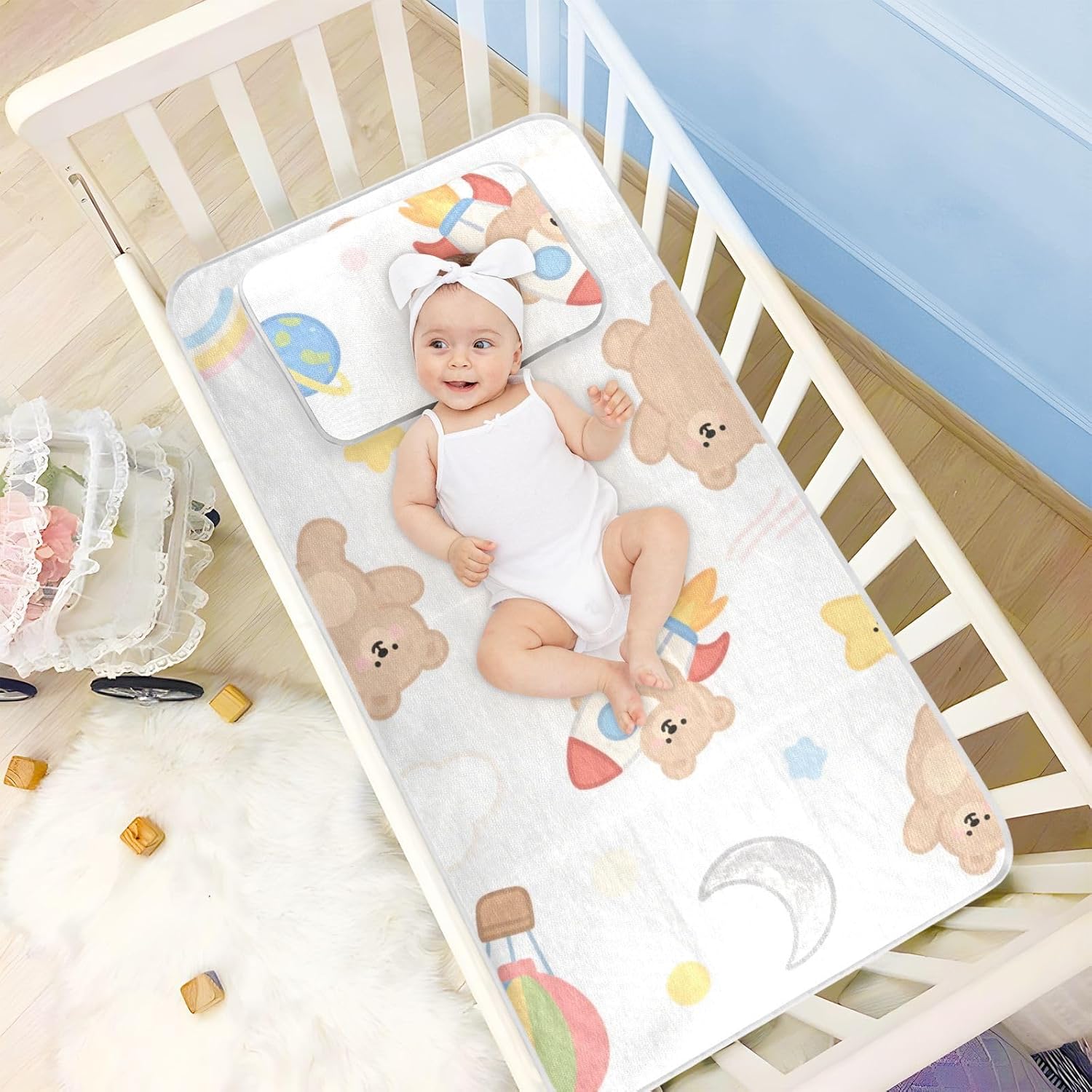 【Cooling Material】-- Made of ice silk fabric with breathable hole & thicken mesh, this mattress cover gives your baby coolness, coziness, and breath-ability in summer. Cool but not cold for your baby. Skin-friendly feature is good for baby in sensitive skin.【Standard Size】--28 x 52 inch { is designed to fits most standard pack n play.Mattress a rounded edge design to ensure a tight fit with the four corners of the crib, reducing gaps and providing a safer play and sleep space for the little 1.Please measure your crib size before you buy to ensure a perfect fit【Soft and Skin-Friendly】-- Made with soft knit fabric, our mattress protector is gentle on delicate skin. The good materials and thoughtful design will make your baby or toddler experiences a cozy and restful sleep.【 Gift Baby】-- This mattress protector pad is a must have for your baby to sleep and play well. A perfect Gift baby birthday and baby shower.【Easy Care】--Convenience is key for busy parents. Our waterproof crib mattress pad is machine washable, making it easy to keep clean and fresh. Simply toss it in the washing machine for cleaning. It’s and maintains its quality after wash, providing long-lasting protection.