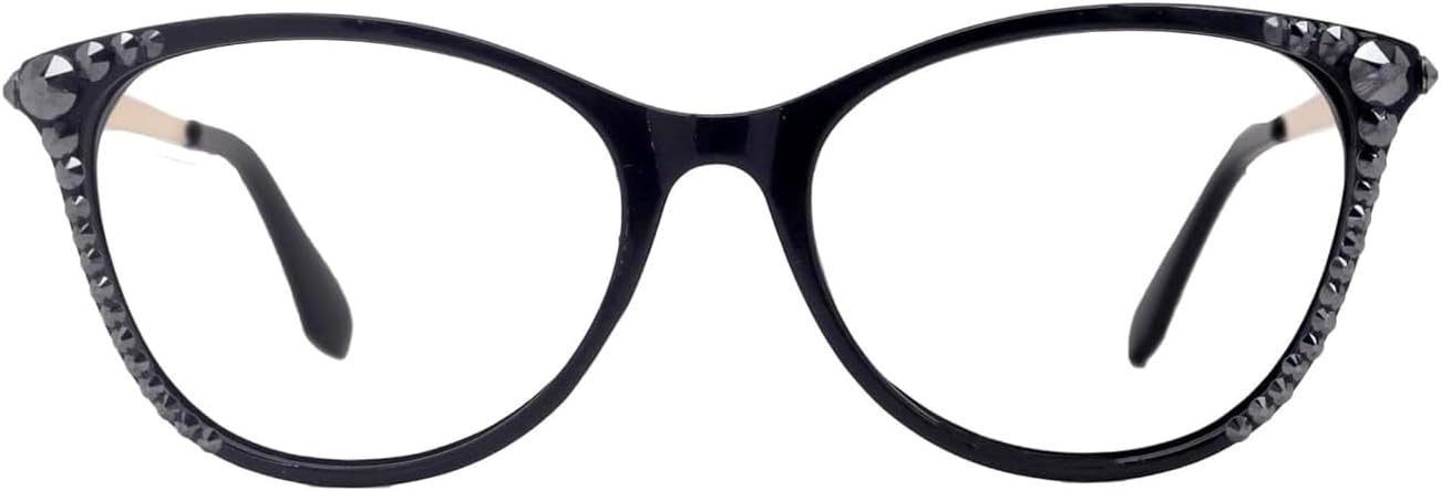 Hand-Crystalized in the USA with genuine European crystals, these women’s reading glasses feature optical Reading quality, fully magnified aspheric lenses, and a lightweight plastic frame. Scratch-resistant lenses and lead-free materials provide durability and everyday comfort. Large Cat-eye style black frame. Includes a matching padded case and a black microfiber soft case. Size: 54–15–133 mm. Width: 136mm, Height: 44mm