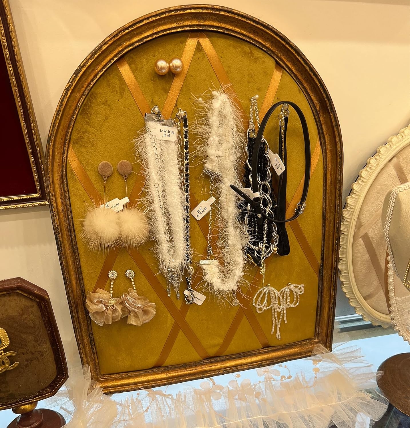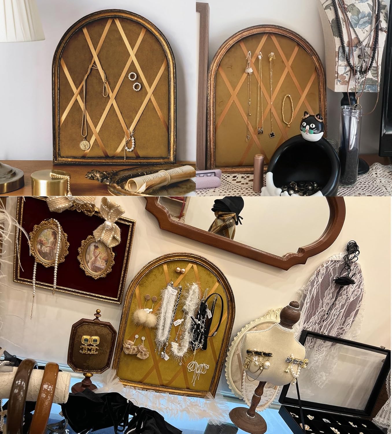 VitaEst Arched Shape Wall Mount Earring Holder Organizer,Hanging Earring Holder Organizer Jewelry Tray for Drawer Stud Earring Storage Specifications: material: frame-resin, inside- velvet and foam dimension: height 39cm,length 31cm,depth 2cm. Finish: antique gold Features: Antique Gold Resin Frame: The earring organizer for girls features a finely crafted resin frame with an antique gold finish that exudes a timeless charm reminiscent of classic heirlooms. Function: Inside the frame, the velvet and foam backing provides ample space for hanging and displaying your earrings, keeping them organized and easily accessible. Wall Mounted: Thewall earring organizer ensures that your earring collection is showcased beautifully while freeing up valuable dresser or vanity space. This earring organizer wall is not only a functional storage solution but also a decorative piece that adds a touch of sophistication and old-world glamour to your room. Great Gift: Perfect for anyone who appreciates the blend of antique aesthetics with modern convenience, this earring organizer is a stylish addition to any home.